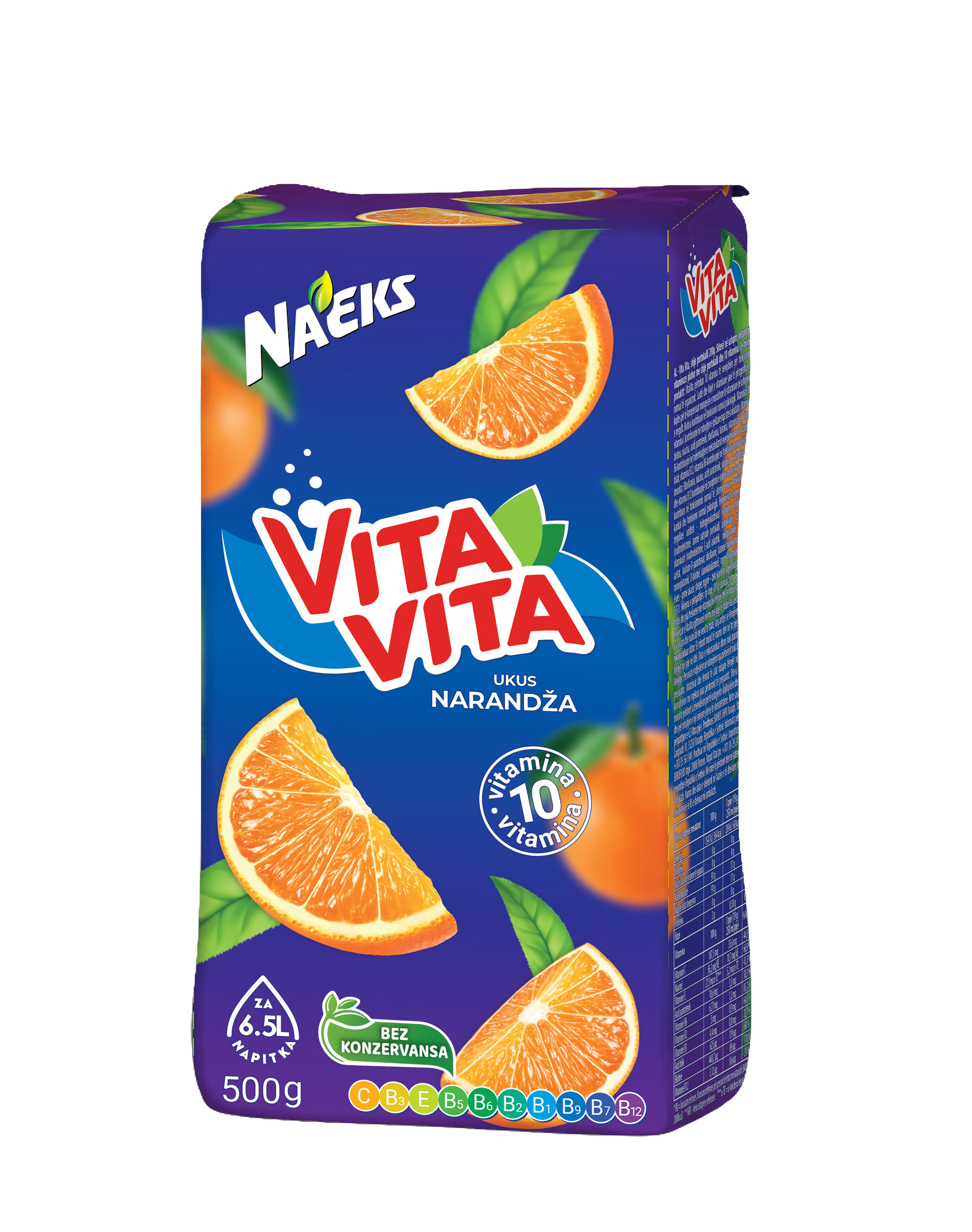 Food supplement. Vitamin instant drink powder with orange flavor and 10 vitamins.